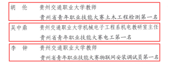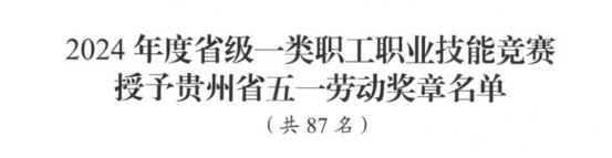 近日,贵州省总工会发布《2024年度省级一类职工职业技能竞赛授予贵州省五一劳动奖章名单》,我校胡伦、吴中鼎、李钟三位教师凭借精湛的专业技能与优异的赛场表现,被授予“贵州省五一劳动奖章”称号。